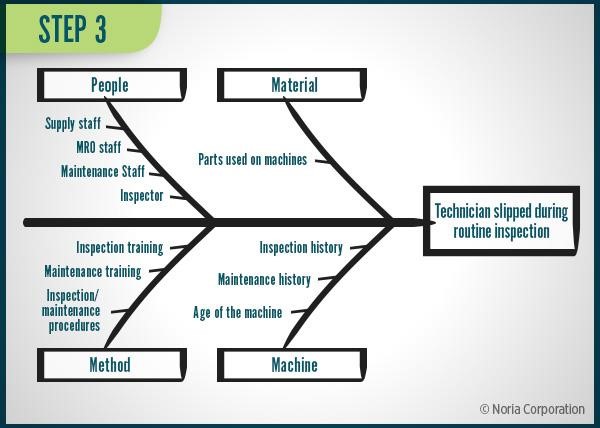 Trong ví dụ của chúng tôi, nhóm đã xác định nguyên nhân có khả năng nhất của sự cố là cần cập nhật hướng dẫn bảo dưỡng để chỉ định loại phớt và vật liệu làm kín nào cần được đặt hàng cho máy được đề cập. Nhìn bề ngoài, có vẻ như nguyên nhân có thể liên quan đến việc bảo trì không đúng cách dẫn đến rò rỉ.