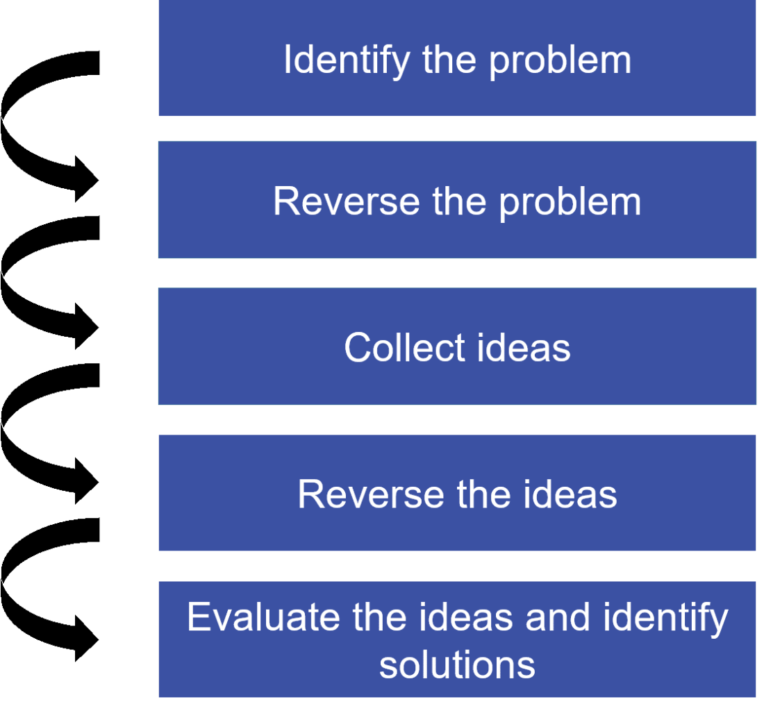 - Đảo ngược lại vấn đề: Sau khi xác định vấn đề cần giải quyết, các thành viên trong nhóm sẽ tiến hành định nghĩa các yếu tố ngược lại của vấn đề đó. Điều này có nghĩa là định nghĩa các yếu tố mà khi có chúng, sẽ làm cho vấn đề trở nên tồi tệ hơn hoặc không giải quyết được vấn đề.