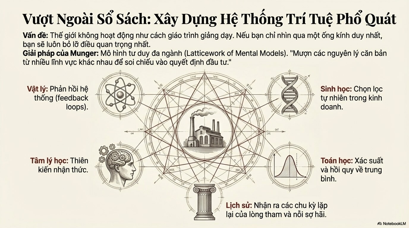 3. Sức Mạnh Của Trí Tuệ Phổ Quát: Phá Vỡ Các “Ống Kính” Tư Duy Hạn Hẹp Tuy nhiên, nhận diện các thiên kiến tâm lý bên trong là chưa đủ. Munger lập luận rằng để thực sự vô hiệu hóa chúng, nhà đầu tư phải xây dựng một hệ thống nhận thức bên ngoài đủ rộng lớn để đối trọng—đó chính là sức mạnh của trí tuệ đa ngành. Ông khẳng định một nhà đầu tư không thể chỉ là chuyên gia tài chính mà phải là một nhà tư tưởng, vay mượn các nguyên lý nền tảng từ tâm lý học, sinh học (chọn lọc tự nhiên trong kinh doanh), vật lý (hệ thống phản hồi) và lịch sử (sự lặp lại của bong bóng tài chính) để có một cái nhìn toàn diện về thế giới. Chỉ nhìn qua lăng kính tài chính sẽ khiến bạn mắc kẹt trong những cái bẫy tư duy.