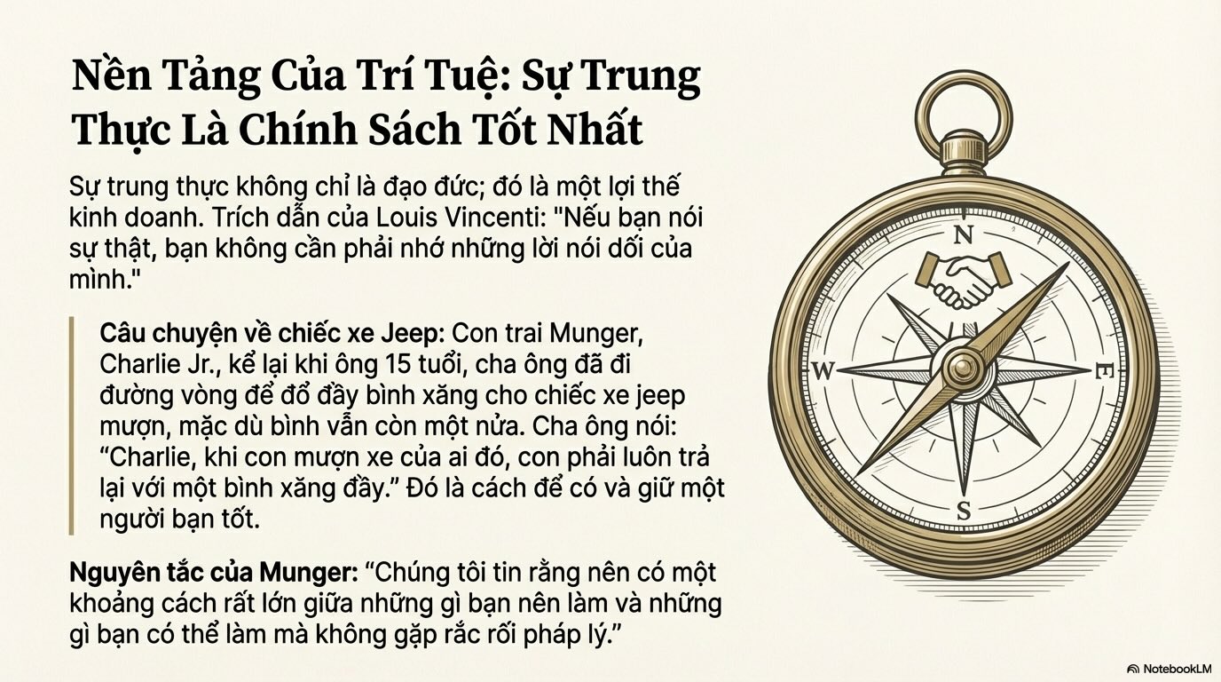 - Sống có đạo đức và đáng tin cậy: Câu chuyện Munger dạy con trai phải luôn trả lại xe đã mượn với bình xăng đầy chứa đựng một bài học sâu sắc về sự chính trực. Chiếc xe đó thuộc về Rick Guerin, một người bạn thân mà Munger biết “chắc chắn sẽ không bận tâm, và có lẽ cũng không để ý” nếu bình xăng vơi đi. Bài học không phải là để gây ấn tượng với người khác, mà là về một tiêu chuẩn nội tại không khoan nhượng về sự công bằng, ngay cả khi không ai quan sát. Sự tin cậy là tài sản quý giá nhất, một lợi thế cạnh tranh thực tiễn mở ra những cơ hội mà tiền bạc không thể mua được.