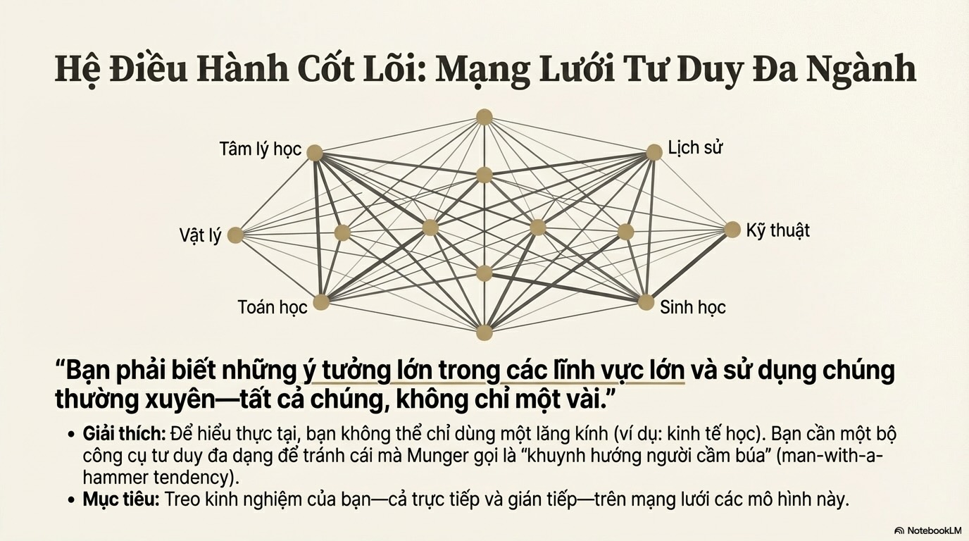 Lập luận của Tác giả: Munger thường trích dẫn câu nói: “Đối với người chỉ có một cây búa, mọi vấn đề đều trông giống như một cái đinh.” Ông áp dụng các mô hình như “mô hình dự phòng và an toàn biên (margin of safety) từ kỹ thuật” để đảm bảo an toàn, hay các “mô hình sai lầm nhận thức từ tâm lý học” để tránh các quyết định phi lý. Mỗi mô hình mới được thêm vào sẽ củng cố toàn bộ mạng lưới, tạo ra một hệ thống tư duy mạnh mẽ hơn.