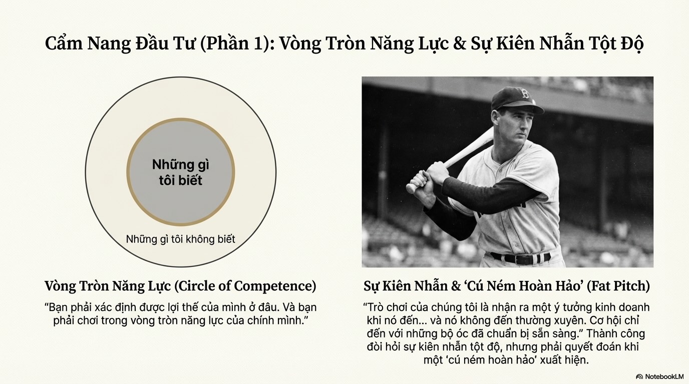 - Biết khi nào cần hành động và khi nào không: Triết lý này có thể được tóm gọn: “chuẩn bị kỹ lưỡng, kiên nhẫn, kỷ luật, và quyết đoán.” Phần lớn thời gian, hành động tốt nhất là “không làm gì cả.” Hãy dành thời gian đó để học hỏi và chuẩn bị. Nhưng khi một cơ hội hiếm hoi và rõ ràng xuất hiện trong “vòng tròn năng lực” của bạn, hãy “đặt cược lớn” và hành động một cách quyết đoán.