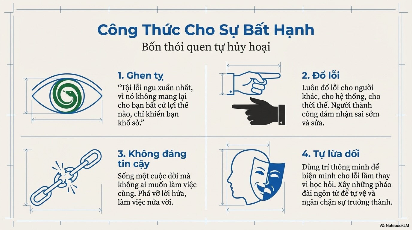 Lập luận của Tác giả: Nguyên tắc này, được ông mượn từ nhà toán học vĩ đại Jacobi (“Invert, always invert”), là một ví dụ điển hình cho cách ông áp dụng các khái niệm từ lĩnh vực khác vào thực tiễn. Nó được minh họa rõ nét trong bài phát biểu tại Trường Harvard, nơi ông đưa ra “công thức cho sự khốn khổ chắc chắn” (prescriptions for guaranteed misery in life). Bằng cách liệt kê những thói quen dẫn đến thất bại, ông đã dạy bài học sâu sắc nhất về cách sống một cuộc đời thành công.